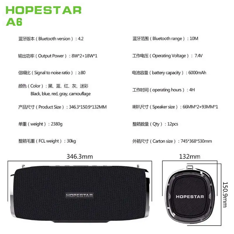 - Product name : Hot 3C- HOPESTAR A6 Bluetooth Speaker Portable Wireless Loudspeaker Sound System 3D Stereo Outdoor